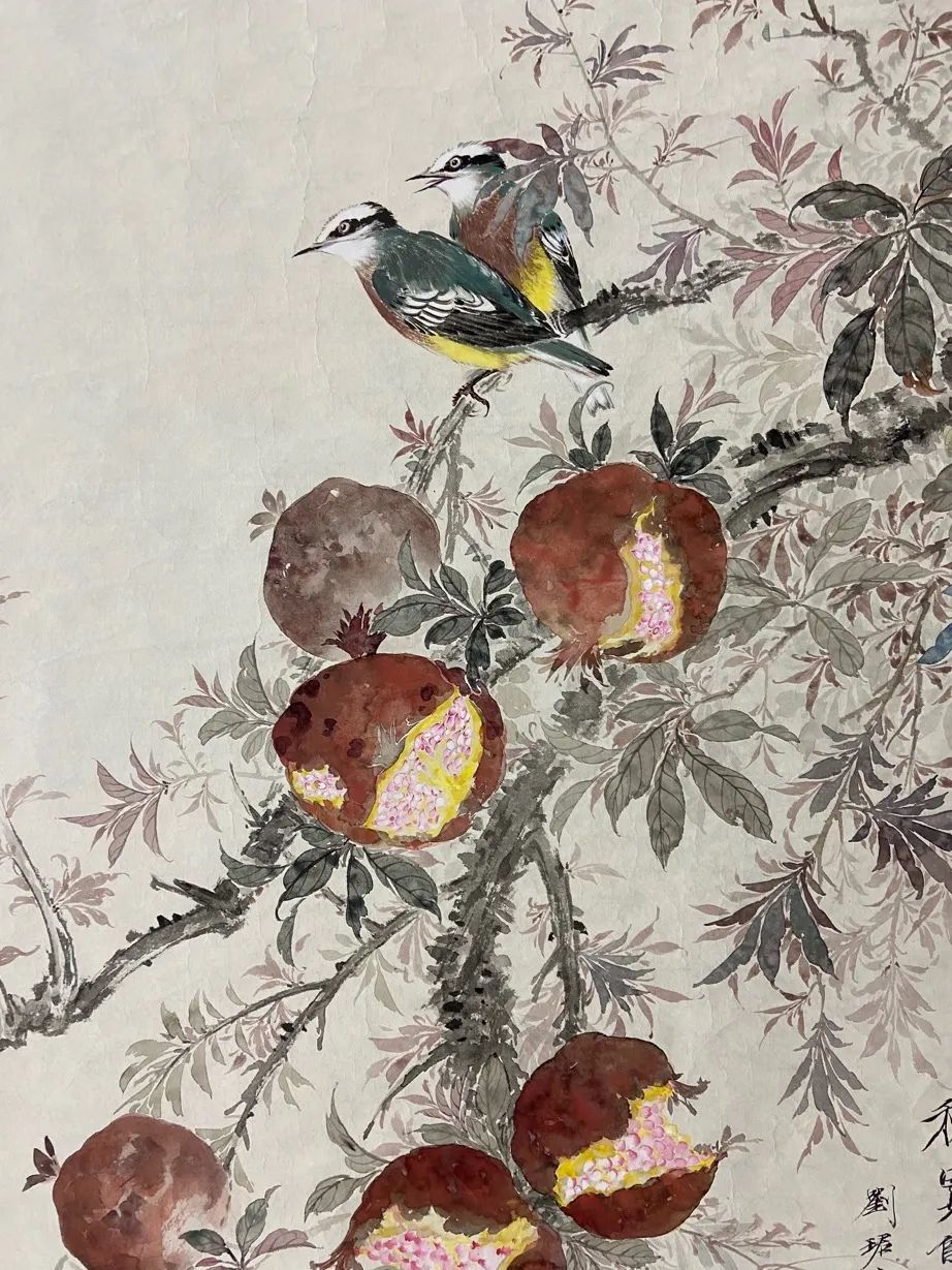 刘珺老师展览作品则以没骨花鸟及文人逸笔风格为主。“没骨”作为中国传统花鸟画重要创作手法,不以线条勾勒,而用色彩渲染造型,具有用色淡雅、注重意境、轻松灵动的特点。现场展出的《秋实图》《翠竹成荫闻水声》等作品,既富有艺术美感,也兼具“春风桃李”、“春华秋实”、“硕果累累”的重要意义;其书法作品凸显“二王”风格,以荀子《劝学》为创作对象,彰显了“学不可以已”、“善假于物”、“锲而不舍,金石可镂”等古人治学经验智慧。