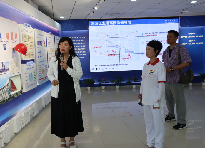 滨海工业研究院直属党支部副书记王春玲带领师生参观了事业发展展厅,详细介绍了滨海院的总体规划、发展历程、工作定位、科研平台以及在创新、人才和产业链等方面取得的丰硕成果。滨海工业研究院副院长林漫群结合展出的实物,讲述了天津大学发展历程的重要节点和历史故事,介绍了学校服务国家发展战略、服务区域经济发展、服务科技成果转化等方面的成绩。