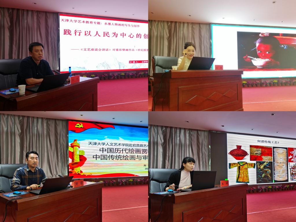 27日下午,人文艺术学院教师孙列、孙锐、刘珺、王坤分别从红色题材艺术创作、生活美学与美育浸润、中国传统绘画史、非遗“双创”方面为宕昌县文化、教育相关领域从业人员进行授课培训,现场掌声阵阵,气氛热烈,参与学习人员展现出极高的学习热情。