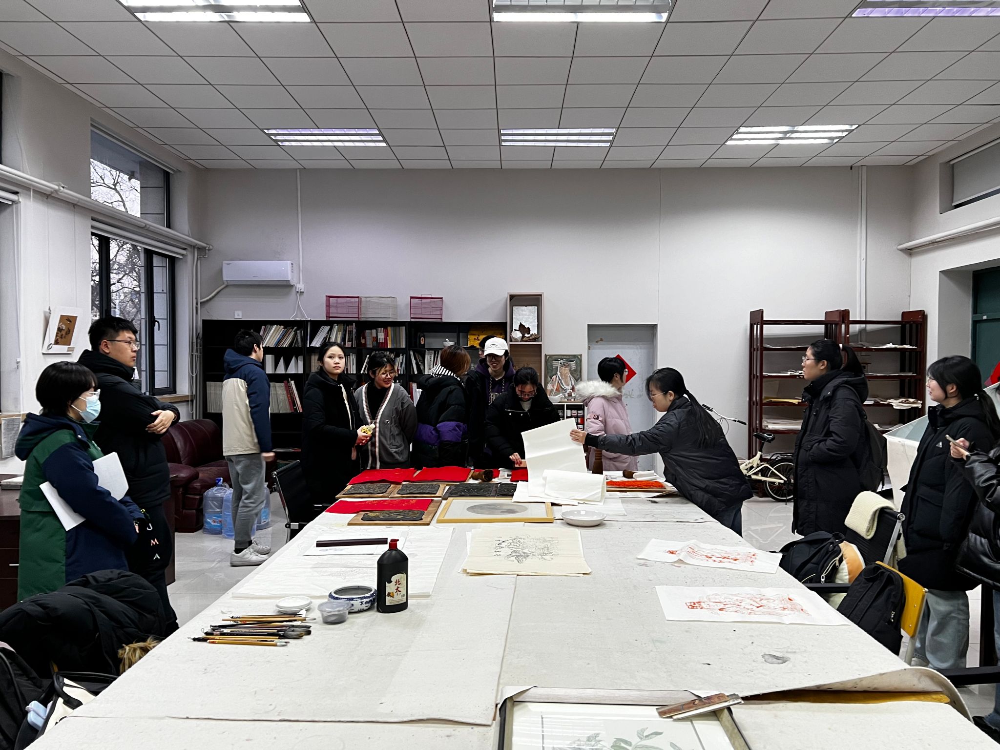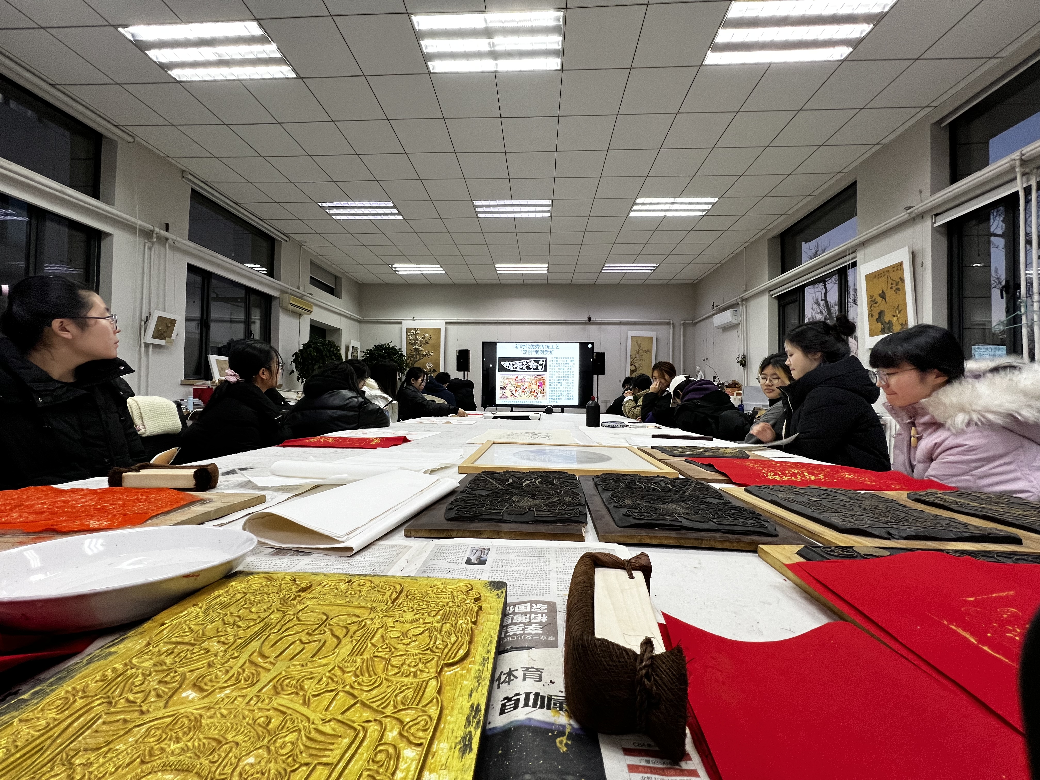 副教授王坤为学生准备的“年画赏析与拓印”,不仅让同学们更加深入地了解年画的创作过程、艺术特色和价值意义,还带领他们亲自尝试年画的拓印和绘制,激发大家对中华文化的兴趣和热爱。同学们纷纷尝试拓印技术,对自己印制的年画爱不释手,进一步感受了年画的艺术魅力和文化内涵,增强了对民间艺术的敬畏。