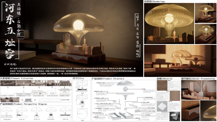 这款灯具文创纪念品以河东区五处百年历史建筑为元素,将传统与现代完美融合。灯具由曲面灯罩、海河元素装饰面板、五景文创牌等14个部分组成。可拆卸结构不仅方便组装,还为产品外观增添了多样的变化。在材质选择上,全部采用环保材料,生产成本较低,且具备良好的耐性,使用寿命长。作品不仅仅是一个灯具,更是河东历史文化的生动载体,在点亮空间的同时,也让河东的文化记忆熠熠生辉。