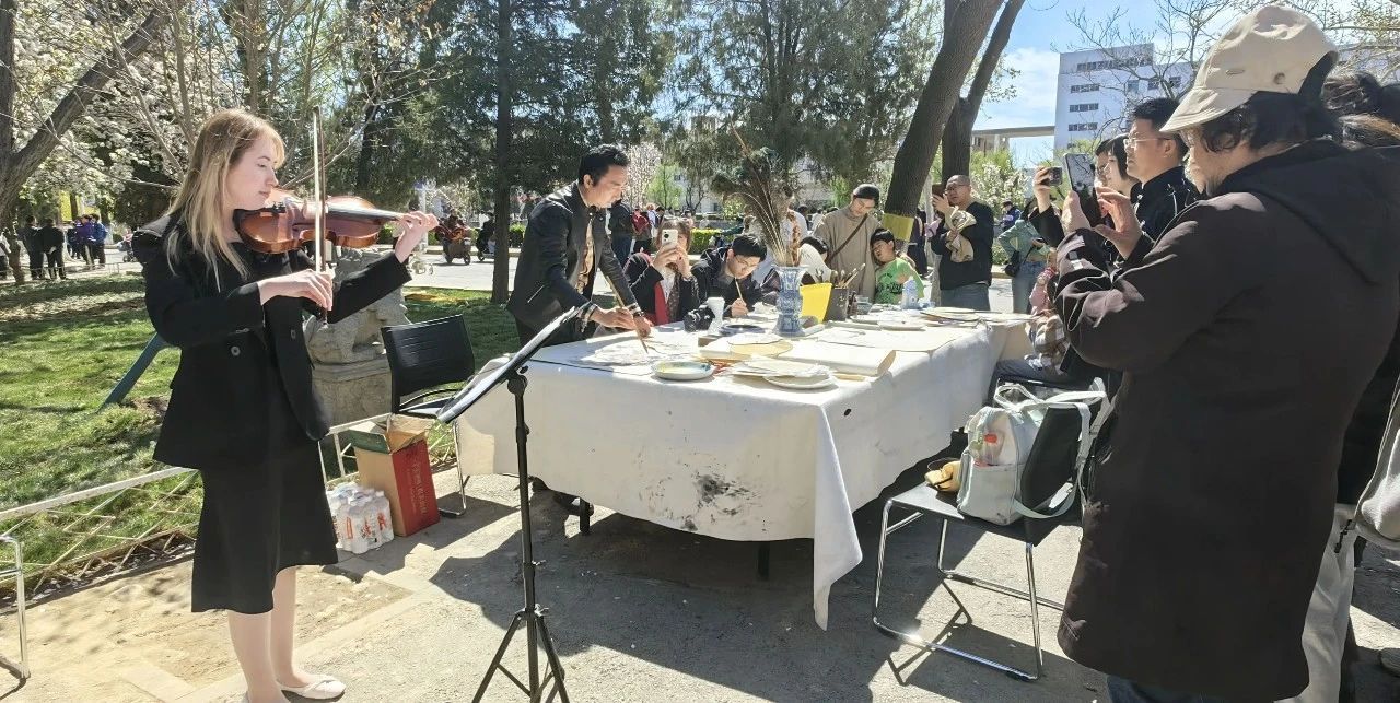 王学仲艺术研究所副教授刘珺与天大各专业学子一起,进行了以“春海棠”为主题的绘画写生活动。天津大学俄罗斯籍研究生奥苏现场演奏《茉莉花》等小提琴曲,随着优美旋律融入丹青落笔,一方方海棠春色被纳入笔墨素纸之中,激荡出更多心灵触动和文化共鸣。活动现场,刘珺老师还指导学生进行了汉服着装人像写生、海棠徽章制作,为天大海棠季增添更多人文艺术色彩。