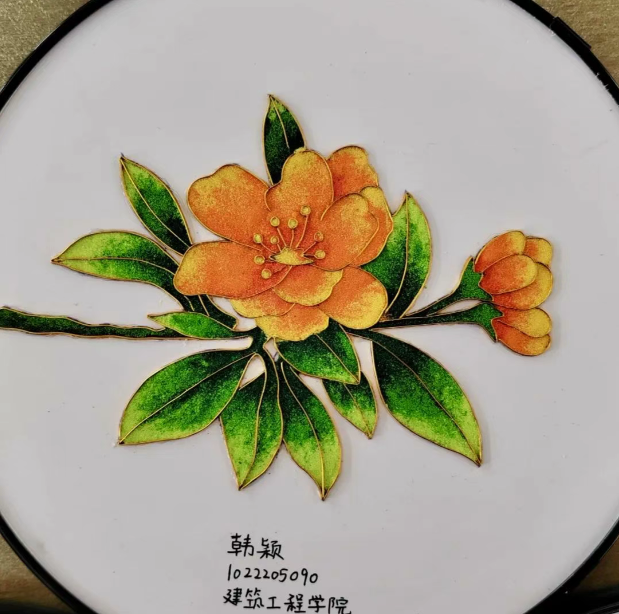 展示过后,谢学华详细讲解了掐丝珐琅的制作环节,包括绘制图案、掐丝、上色,以及制作材料的用途及使用方法。在谢老师耐心指导下,同学们尝试以金丝勾勒绿叶翩跹、彩砂点染海棠姿色,将海棠嫣然凝于方寸之间。