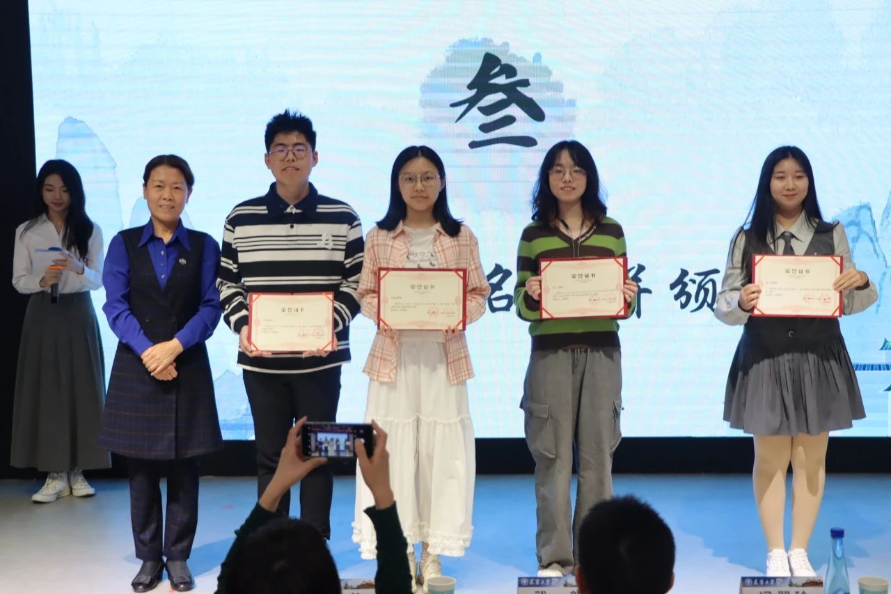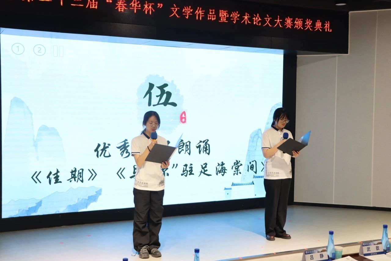 与会嘉宾为获奖同学颁发获奖证书。据悉,本届比赛收到了来自各学院各年级同学的积极投稿,共计206份。其中文学赛道作品112份,学术论文36份,专题征文38份,AI赋能写作赛道20份。经过评委会评审,共有57份优秀作品获奖,其中文学作品30 份,学术论文10 份,专题征文10 份,AI赋能写作赛道7份。