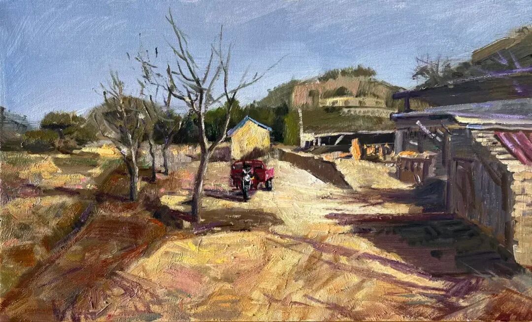 陕北郭家沟以其独特的黄土高原风貌和质朴的乡村生活成为油画创作的灵感源泉。这幅作品以厚重的笔触和温暖的色调,展现了农家场景。画面构图采用横向延展的形式,突出高原的辽阔感。同时,通过光影的明暗对比,强化山峦的立体感和农家的沧桑质感。色彩运用上,以土黄、赭石为主基调,搭配深褐与暗红,表现黄土的浑厚与岁月的痕迹,点缀以湛蓝的天空和金黄的庄稼,增添画面的生机与层次。笔触粗犷而富有肌理,既体现陕北地貌的粗粝感,又表现细腻的局部刻画。作品旨在通过艺术化的视觉语言,记录陕北特有的地理与人文风貌,传递黄土高原的坚韧精神与朴素之美,唤起观者对传统农耕文化的共鸣与思考。