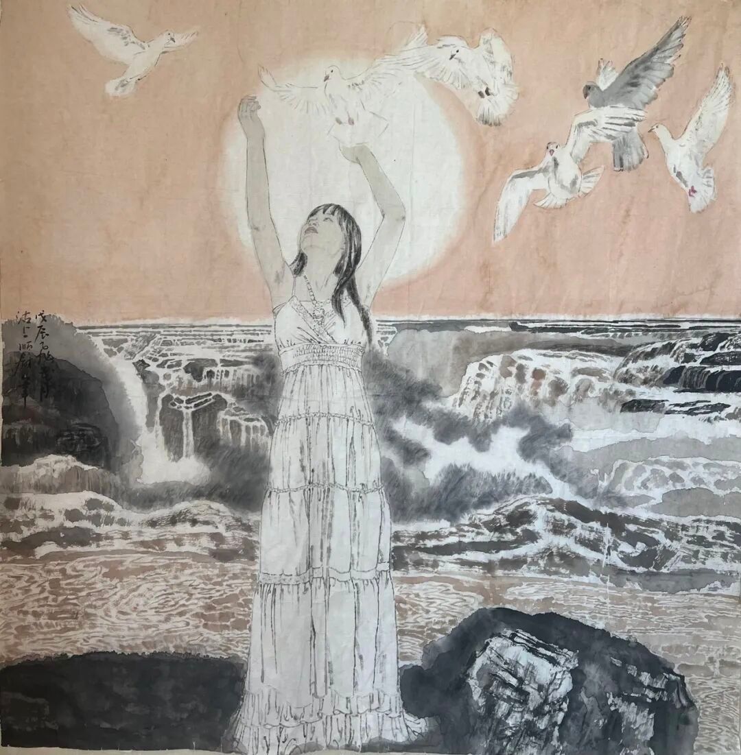 《和平》人物画的模特为天津大学学生,化身为和平使者放飞和平鸽。背景为祖国母亲河——黄河。瀑布永流,太阳圆满。