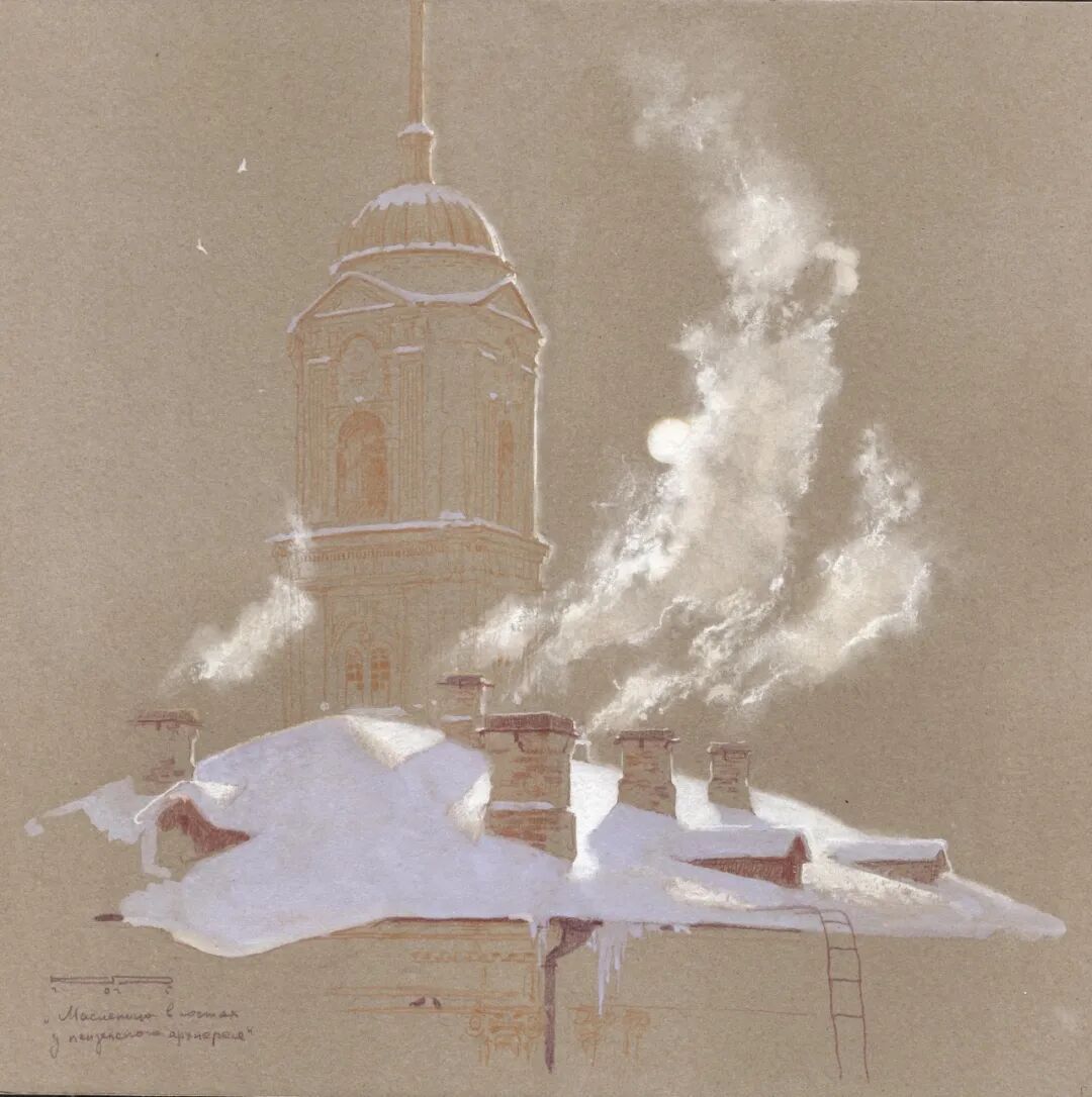 作品展现了艺术家对故乡景致的独特感受。丹尼斯·科罗布科夫善于在画布上营造空气与光的氛围,他以纯净的白色描绘耀眼的雪景与明媚的阳光,使建筑仿佛漂浮在光影之间。画面中,节日的烟雾在阳光下闪烁,皑皑白雪反射出晶莹光泽,赋予整个场景一种梦幻而庄严的气息。这种以白色为核心的表现方式,是艺术家个人的独创手法,也让奔萨的城市风貌呈现出全新的艺术视角。