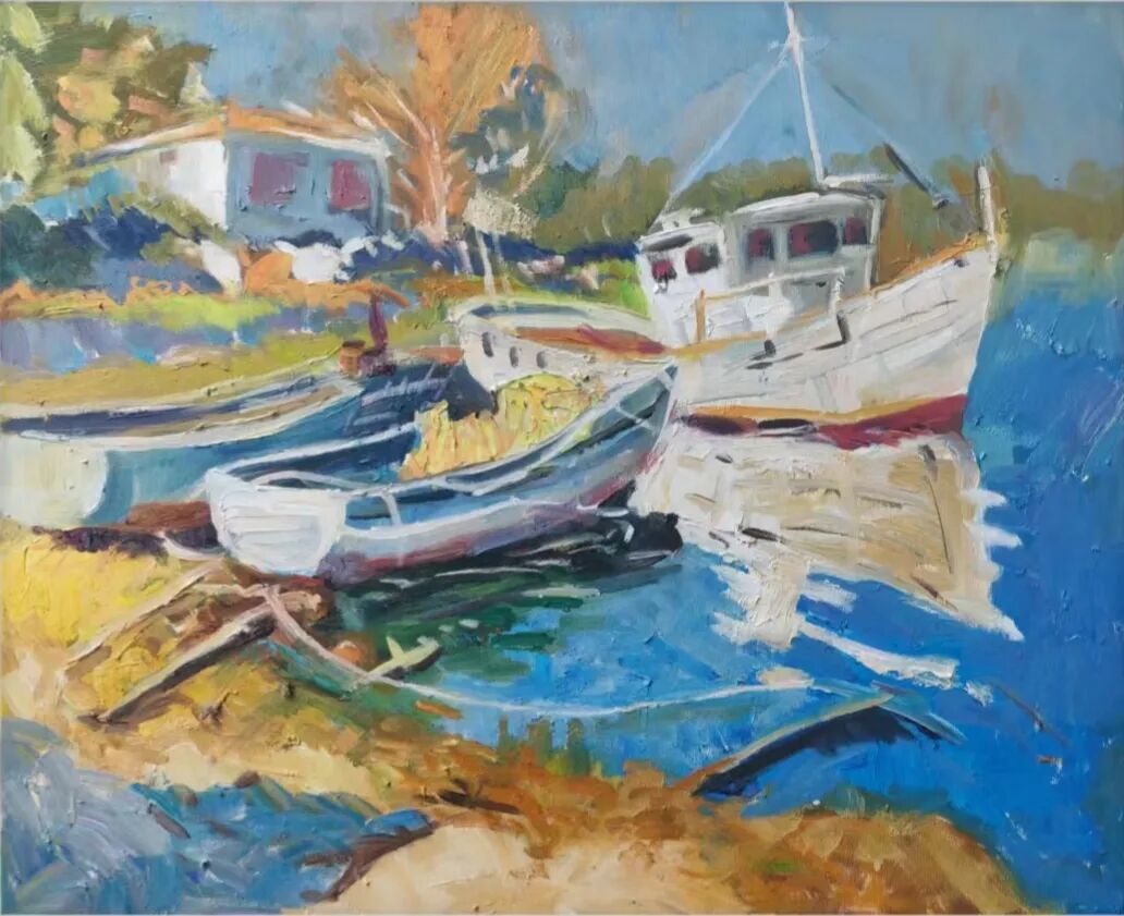 《港湾渔歌》的创作灵感,源于我近期去海边的一次与宁静港湾的邂逅。在那里,船只静静停泊,与周围的自然环境和谐相融。港湾里弥漫着渔家生活的质朴气息,那一瞬间的美好画面,深深烙印在我的脑海中,让我迫切地想要用画笔将这份宁静与美好定格下来。所以我回来后,就搜集了素材,创作了这幅作品。同时,我希望观者在欣赏作品时,能够暂时忘却城市的喧嚣,沉浸在港湾的宁静氛围中,感受到那份来自大自然和质朴生活的美好与治愈,唤起内心深处对宁静、平和生活的向往。