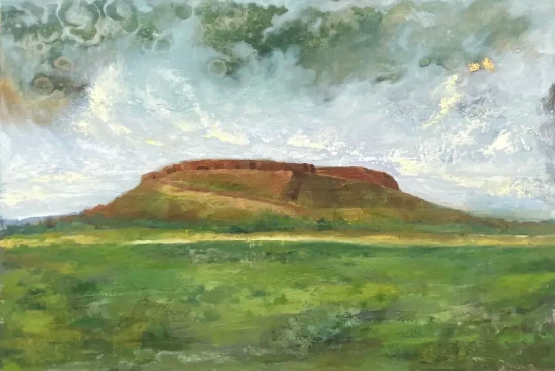 作品描绘了草原深处的一座巨石山丘。方正的山体如同天然的丰碑,屹立于无边的草原之上,给人以敦厚、沉稳而又雄浑的力量感。画面上空,云气蒸腾升起,与山丘的厚重形成强烈对比,既显出大自然的辽阔与动态之美,也赋予作品一种向上的精神意象。