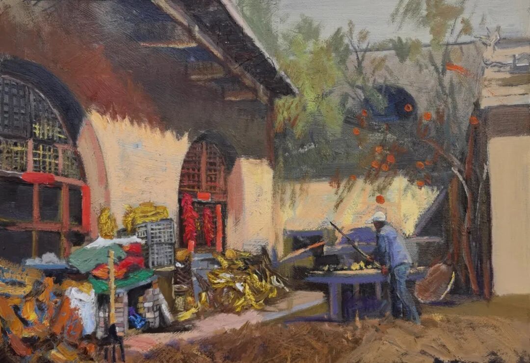 这幅作品聚焦陕北农家院落日常。窑洞建筑、劳作人物与丰收作物,传递质朴温暖氛围。堆积的玉米、悬挂的红辣椒,是丰收符号;人物专注劳作的动态,是定格乡村生活的真实切片。留存乡土记忆,捕捉平凡日常里的烟火气,透过斑驳色彩与厚重肌理,触摸乡村的岁月温度,感受传统农耕生活的质朴与韧性,唤醒对乡土情怀的共情与珍视。