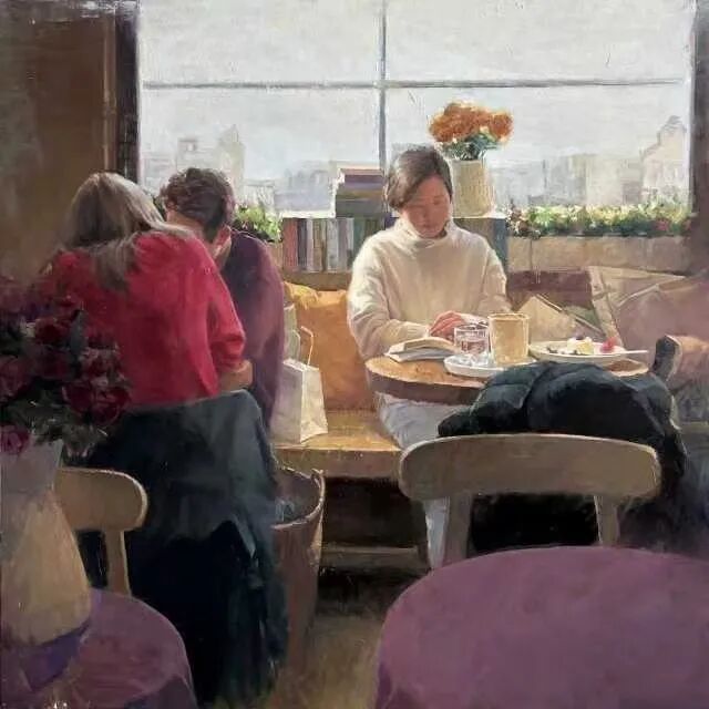 这幅作品聚焦于城市咖啡馆一隅,旨在捕捉日常里的闲适诗意。以柔和光感为引,将窗边场景缓缓铺陈——人物姿态自然松弛,或低语交流、或专注阅读,传递出都市人在快节奏中偷得的片刻宁静。画面用色温暖且克制,米白、深红与淡紫交织,平衡空间层次。光影通过细腻笔触晕染,从窗棂洒入的自然光,柔化了物体轮廓,让书籍、杯盏、花卉都承载着生活温度。背景中模糊的城市天际线,与近景的鲜活烟火形成呼应,暗喻喧嚣与静谧的共生。创作意图是借这方小天地,唤醒观者对平凡场景的珍视,在具象写实里,藏着对“慢生活”的向往,让每个驻足画前的人,都能打捞起属于自己的、关于温暖与松弛的记忆碎片。