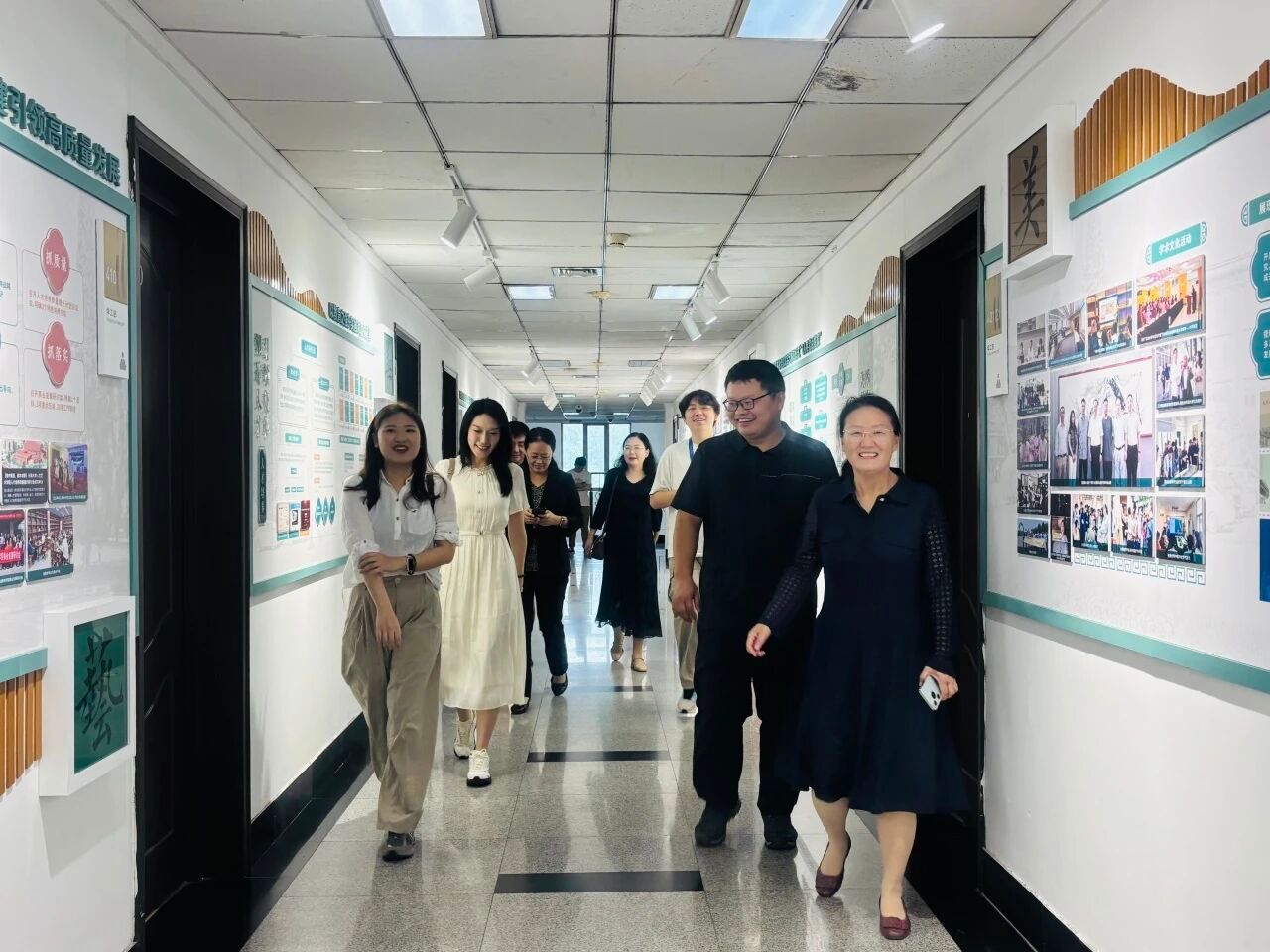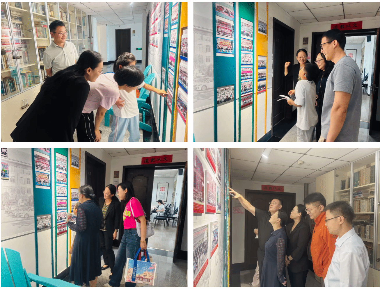 校友们还在老师的指引下来到学院的照片墙前,仔细辨认毕业照上一张张青春的面容。他们时而指着某个身影开怀大笑,时而相互打趣。一张张照片记录着他们的青春年华,也见证着学院的成长发展。