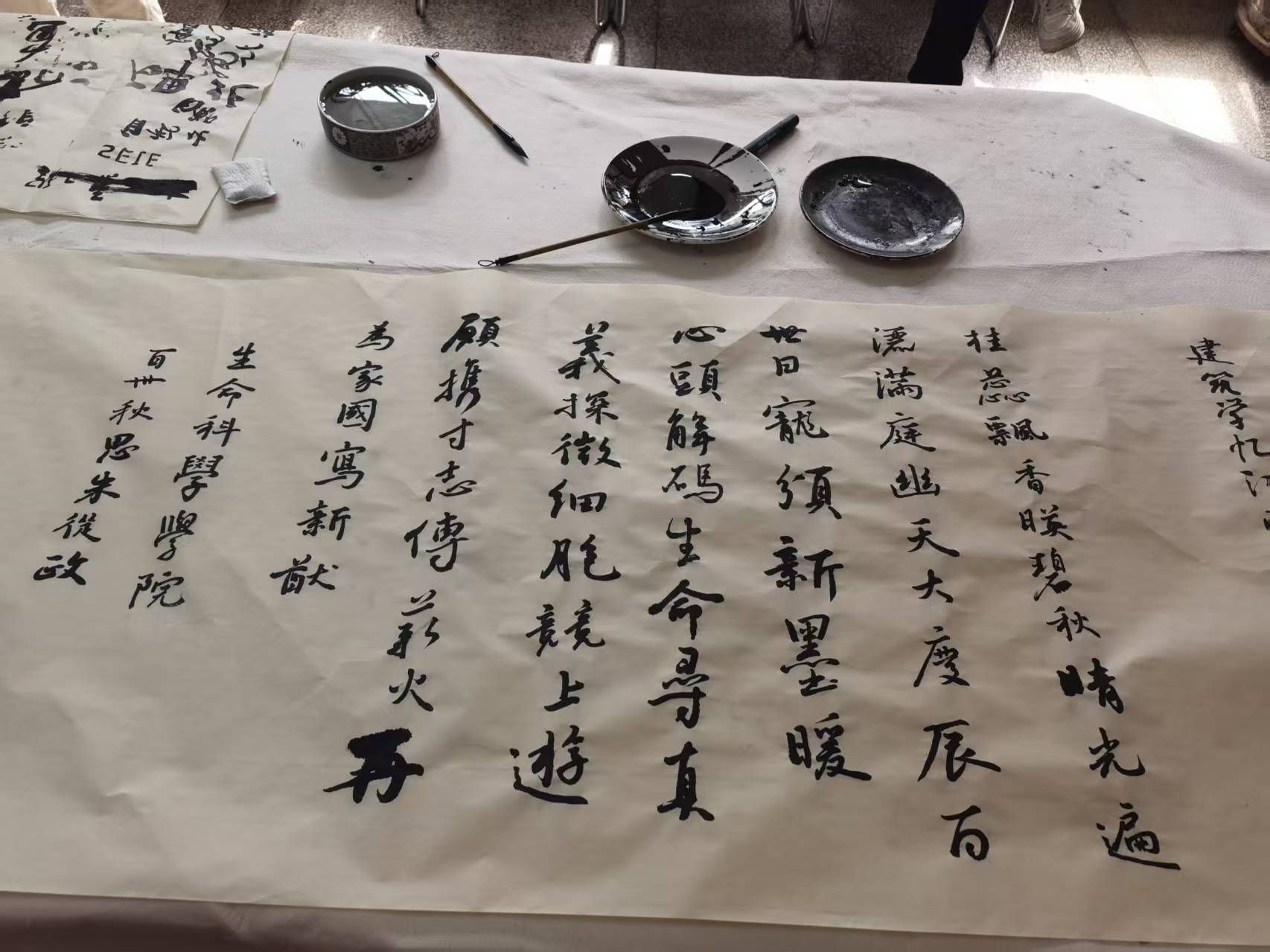 在长卷书写环节,在场师生纷纷提笔,将对重要回信精神的理解、对科技报国的担当、对文化传承的自觉倾注于笔端。他们或誊抄回信金句,或结合学科专业特色书写原创诗词,情真意切。“一纸书信,情深意长,如灯塔,如号角”“躬耕九壤,求索八荒”“以碧波为笺,向海图强”“笃志机械机器域,精研创新破难关”“解码生命寻真义,探微细胞竞上游,愿携寸志传薪火,再为家国写新猷”……一字一句,满是对未来的坚定承诺。现场参与者沉浸在书法创作的氛围中,时而专注落笔,时而相互交流书法技巧与感悟,笔墨流转间,充满对重要回信精神的深刻思考与对理想的热忱追求。