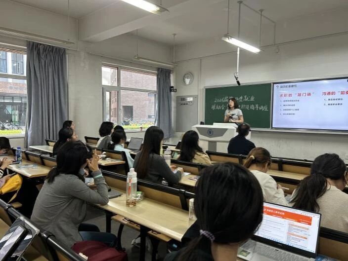 史静老师分析了往届毕业生的就业情况,强调要系统关注就业招聘信息,有针对性地寻找工作。她表示,当下是就业准备的黄金时期,同学们要精心准备,抢占先机,并从三个方面给出就业建议:在心态调整上,要认清宏观就业形势和专业形势,合理调整期望值;在技能提升方面,要系统性地提升求职核心竞争力,进行资源对接,增强信心;在信息获取上,要拓宽信息渠道,甄别招聘信息,在实践中提升决策能力。