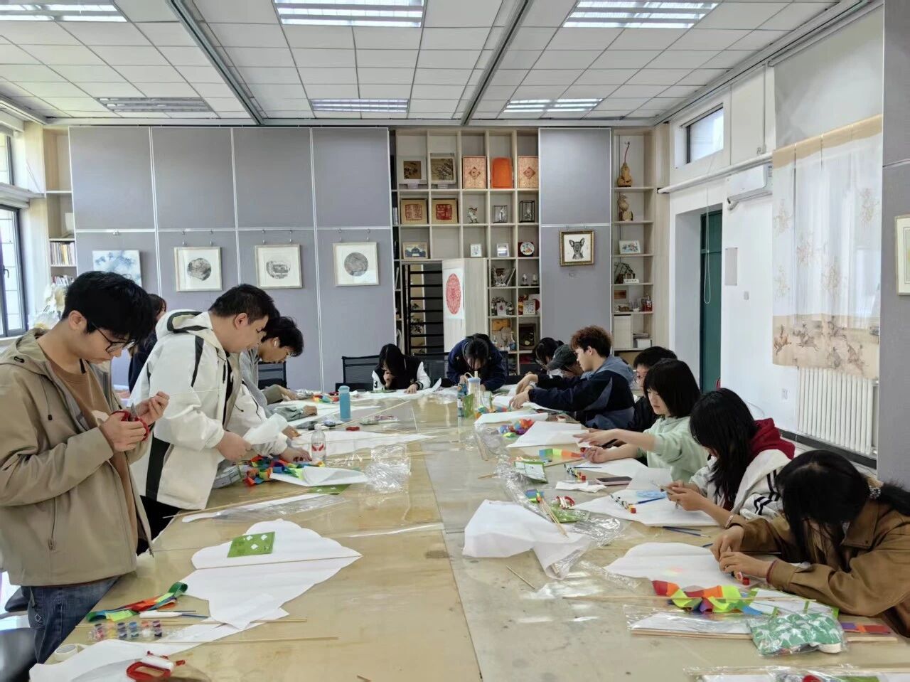 春风拂校园,彩绘致青春。为落实美育、劳育要求,传承风筝文化,丰富学生课余生活,4月10日下午,人文艺术学院“艺鸢践劳 传韵致知”风筝制作实践活动在工笔重彩研究所举办,工笔重彩研究所所长曹铁娃、辅导员陈羲和人文艺术学院本科生参与活动。